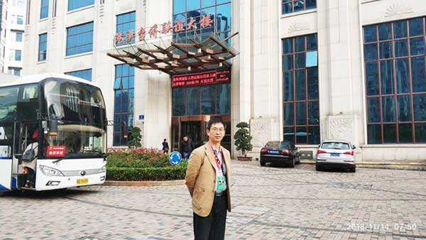 图为:一带一路通讯社执行总编辑王群在海外华文媒体采访团下榻的福建宁德“港澳台侨大楼”前留念,海外华侨华人共同期盼早日实现祖国统一大业。