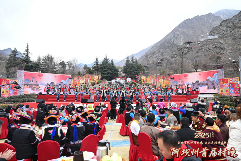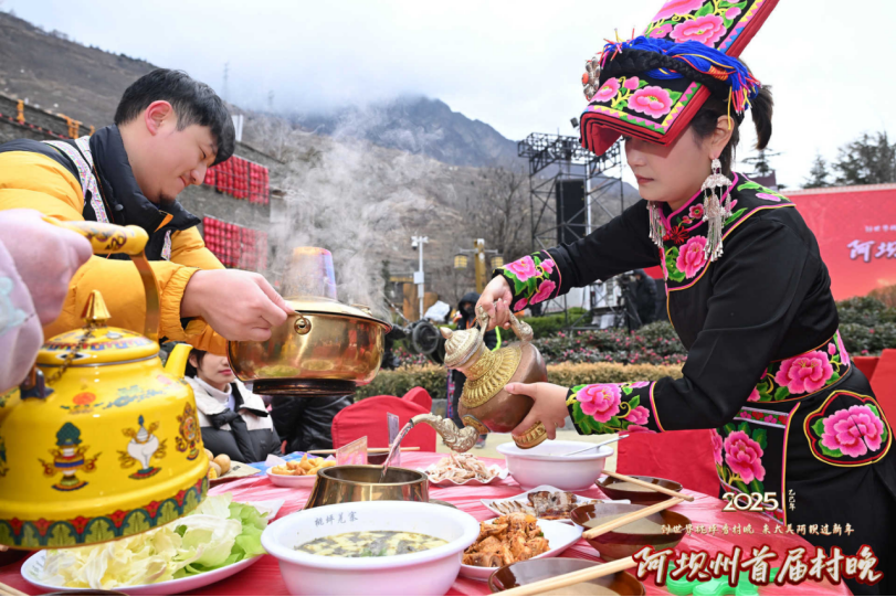 值得一提的是,村晚现场还摆上了热气腾腾的藏羌新年菜肴“九大碗”,让观众能够体验到千年羌寨的独特年味。